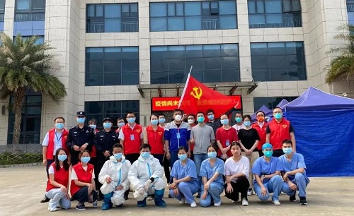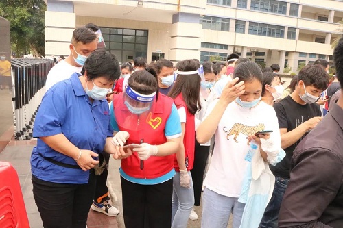 從早上8點半起,周邊企業的員工們就分批來到等待區域?!罢埻@里走?!薄奥闊┏鍪疽幌滦谐檀a?!币荒ò咨c紅色交織的身影,正在進行現場分流引導、幫忙查詢行程,他們正是由邁銳光電黨支部黨員和入黨積極分子組成的7人志愿者隊伍。在他們的助力下,現場每個步驟環環相扣、有條不紊,在當日16時即完成全部6500余人的核酸檢測工作,讓黨旗在防疫一線高高飄揚。