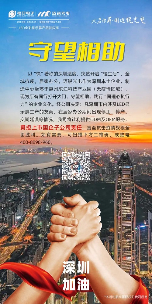 因為疫情,以“快”著稱的深圳速度,也突然開啟“慢”生活。3月15日,邁銳光電發布信息,表示該公司制造中心坐落在無疫情區域的惠州東江科技產業園,如深州市內涉及LED顯示屏生產的友商,在居家辦公期間出現停工、停產、交期延誤等情況,該公司將讓利提供ODM及OEM服務,直至抗擊疫情戰役全面勝利,充分展現其“同理心執行力”的企業文化和“守望相助”的使命責任。