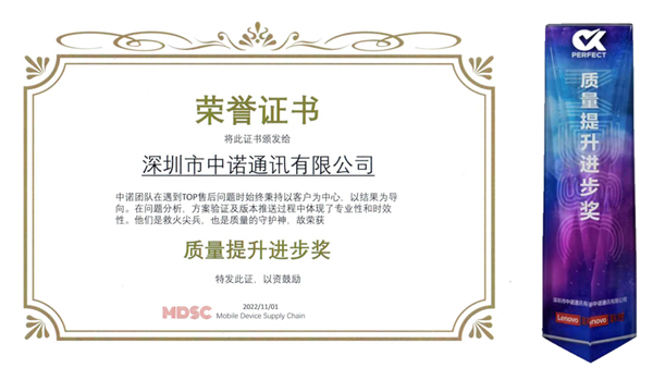 近日,2022年聯(lián)想供應(yīng)商質(zhì)量論壇主題分享及年度頒獎(jiǎng)在線上拉開帷幕,福日電子成員企業(yè)深圳市中諾通訊有限公司在線上出席了此次活動(dòng)。“匠家技最巧,能工事尤精”,今年中諾項(xiàng)目的售后返修率TCRR指標(biāo)滿足目標(biāo)要求并持續(xù)降低,在本次論壇中獲得多次表?yè)P(yáng),并榮獲“聯(lián)想2022年度質(zhì)量提升進(jìn)步獎(jiǎng)”。